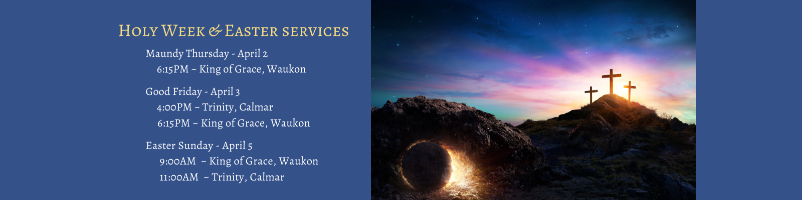 Thank you for visiting! We are a dual parish in northeastern Iowa that shares the Good News of the forgiveness, hope, and salvation that Jesus has won for us. We are a congregation of the Evangelical Lutheran Synod (ELS) which is in fellowship with the Wisconsin Evangelical Lutheran Synod (WELS). Please join us for one of our services at King of Grace in Waukon, Iowa on Sundays at 9:00 AM or Trinity Lutheran Church in Calmar, Iowa at 11:00 AM. All are welcome!